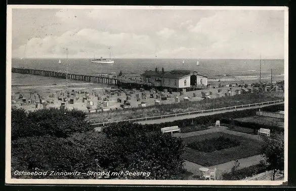 AK Zinnowitz / Ostseebad, Strand mit Seesteg