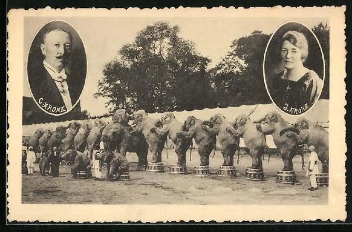 AK Zirkus Krone, Portraits C. Krone u. J. Krone, Elefanten in einer Reihe