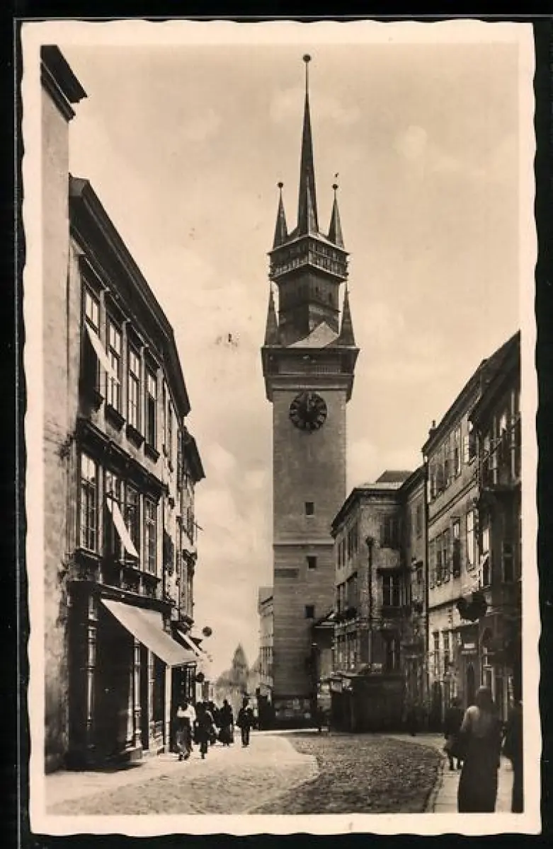AK Znaim a. d. Thaya, Strassenpartie mit Rathausturm