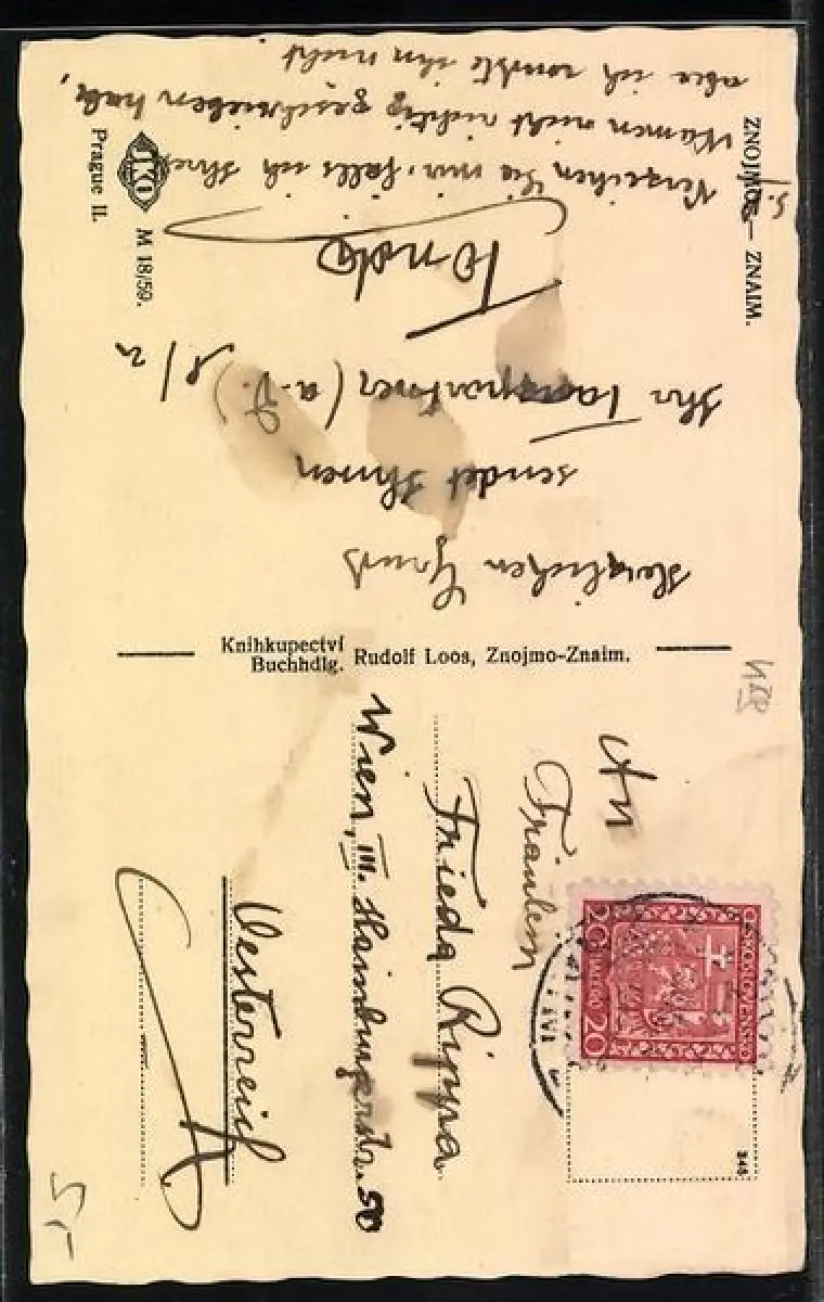 Personenbezogene Daten auf der Rückseite der Karte wurden durch blauen Textmarker unkenntlich gemacht. Die blauen Stellen sind auf die Vorderseite durchgeweicht und wirken sich negativ auf das Postkartenfoto aus