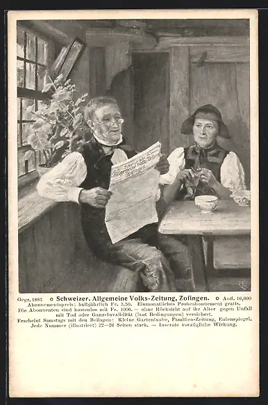 AK Zofingen, Ehepaar in der Stube, er liest die Schweiz. Allgemeine Volks-Zeitung