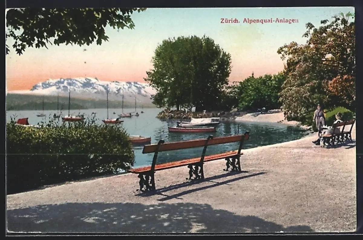 AK Zürich, Alpenquai-Anlagen mit Wasser- u. Alpenblick