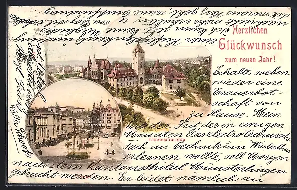 AK Zürich, Landesmuseum, Strassenpartie, Neujahrsgruss