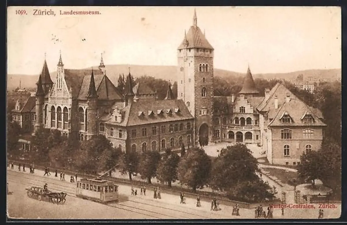 AK Zürich, Landesmuseum mit Strassenbahn davor