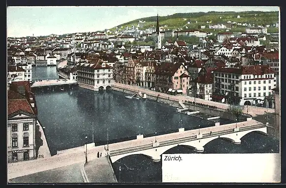 AK Zürich, Partie aus dem Ort mit Kirche, Fluss