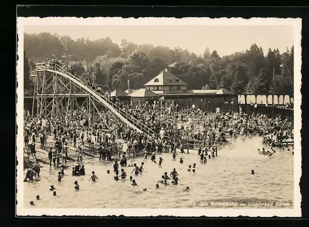 AK Zürich, Sommerleben im Strandbad mit Rutschbahn