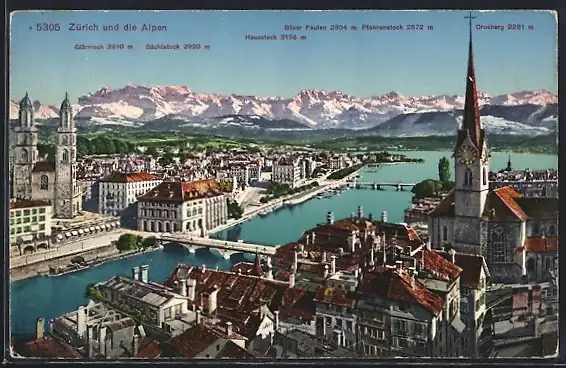 AK Zürich, Teilansicht mit Blick in die Alpen