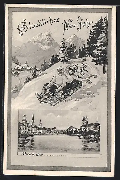 AK Zürich, Uferpartie mit Kirche, Schlittenfahrer auf einem Berg