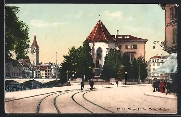 AK Zürich, Wasserkirche und Zwinglidenkmal