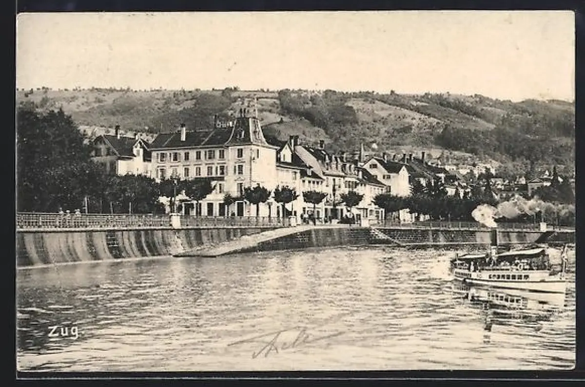 AK Zug, Teilansicht mit Hotel u. Dampfer vom Wasser aus