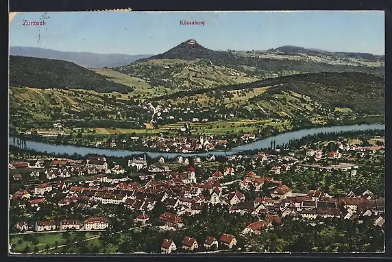 AK Zurzach, Totalansicht mit Fluss und Küssaburg aus der Vogelschau