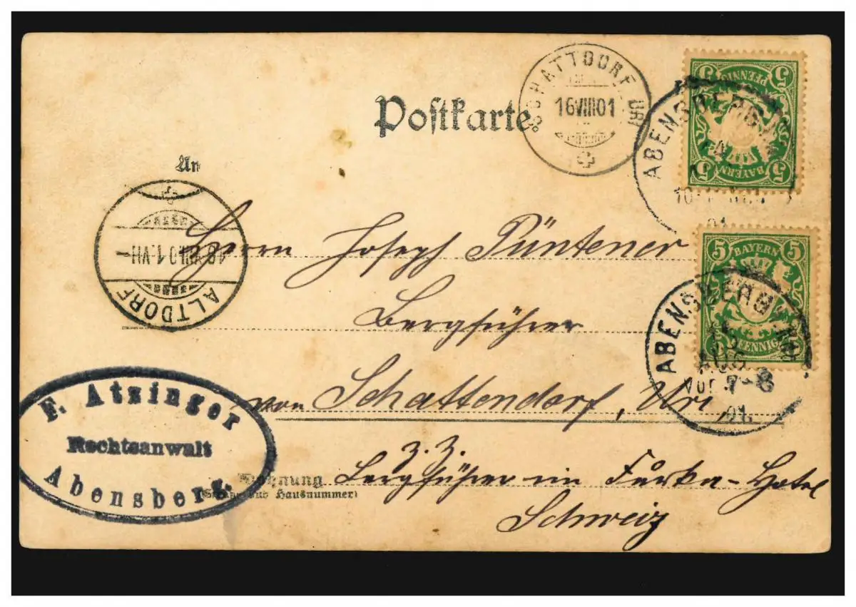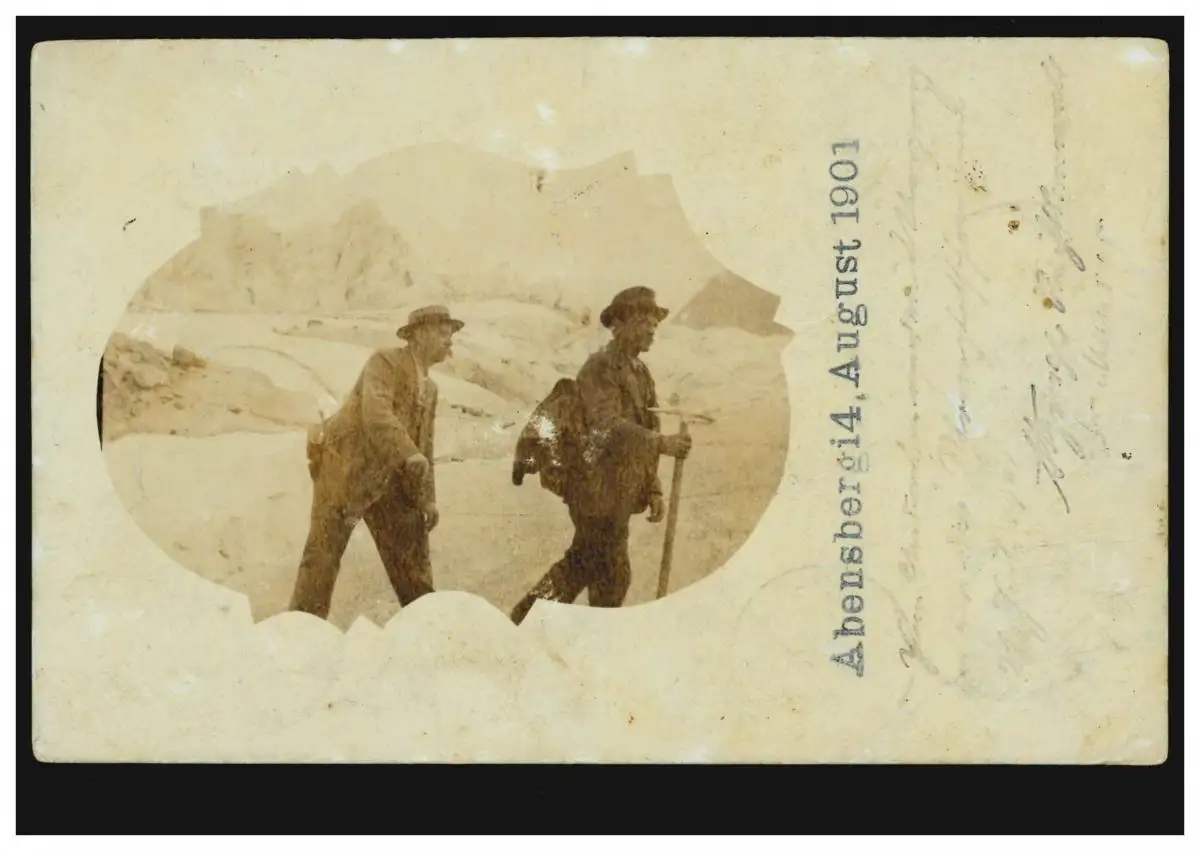 AK Zwei Bergsteiger, ABENSBERG 14.8.1901 über SCHATTENDORF nach ALTDORF 18.8.01