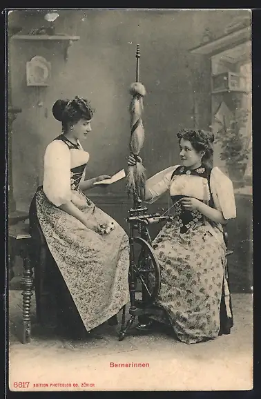AK Zwei Bernerinnen in Tracht am Spinnrad