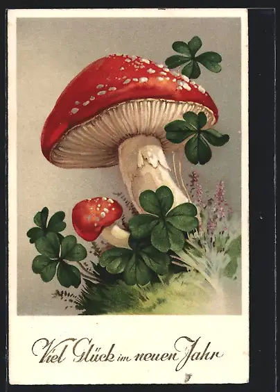 AK Zwei Fliegenpilze mit Kleeblättern, Neujahrsgruss