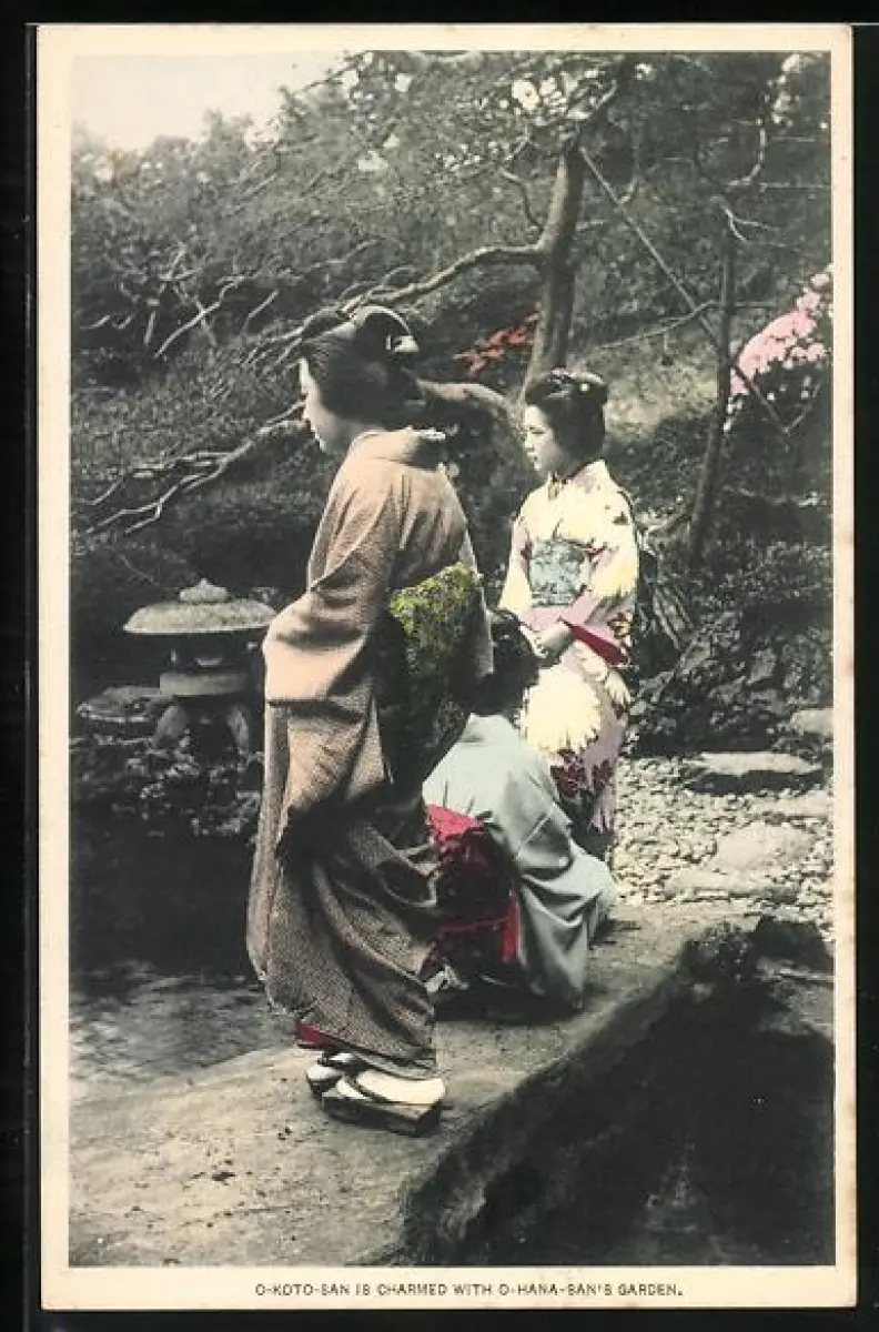 AK Zwei Geishas auf einer kleinen Brücke