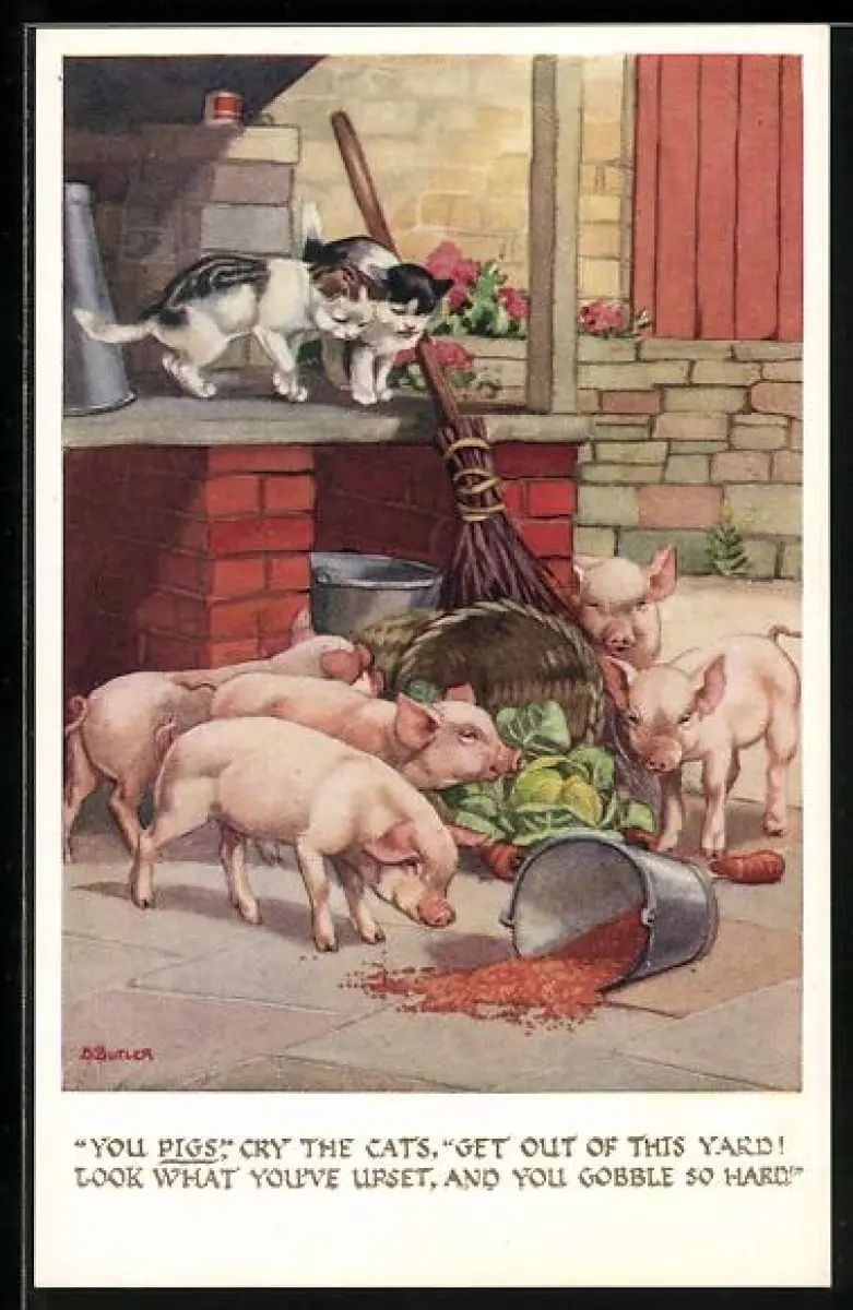AK Zwei Katzen und tollpatschige Schweine auf einem Bauernhof