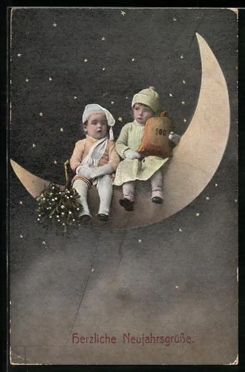 AK Zwei Kinder mit Geldsack auf dem Mond, Neujahrsgruss