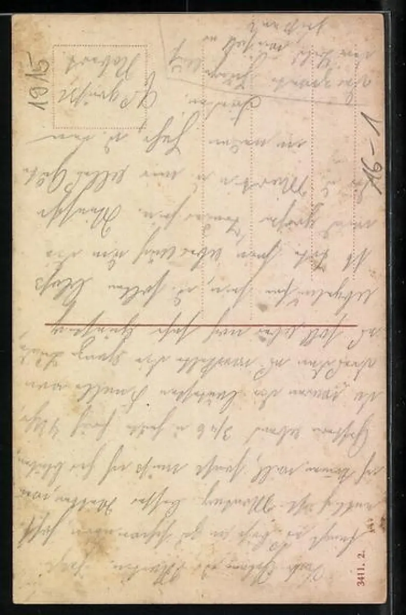 Personenbezogene Daten auf der Rückseite der Karte wurden durch blauen Textmarker unkenntlich gemacht. Die blauen Stellen sind auf die Vorderseite durchgeweicht und wirken sich negativ auf das Postkartenfoto aus