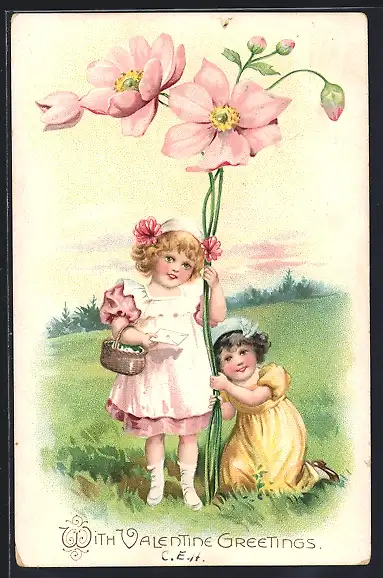 AK Zwei Mädchen stehen unter riesigen Blumen, Valentinstag