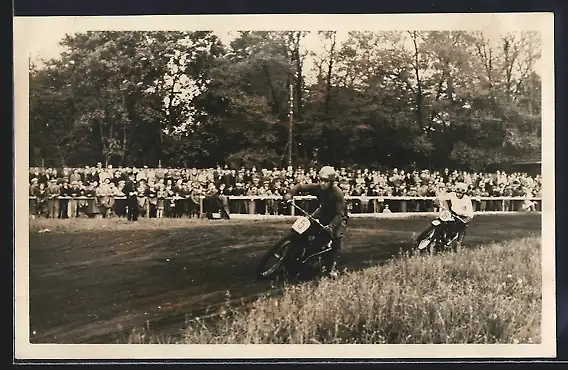 AK Zwei Motorrad-Rennfahrer mit ihren Maschinen in der Kurve, Startnummern 5 und 16, Speedway