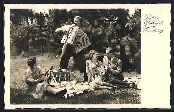 AK Zwei Paare beim Picknick, einer mit Akkordeon