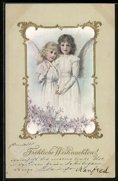AK Zwei Weihnachtsengel in goldenem Rahmen, Fröhliche Weihnachten