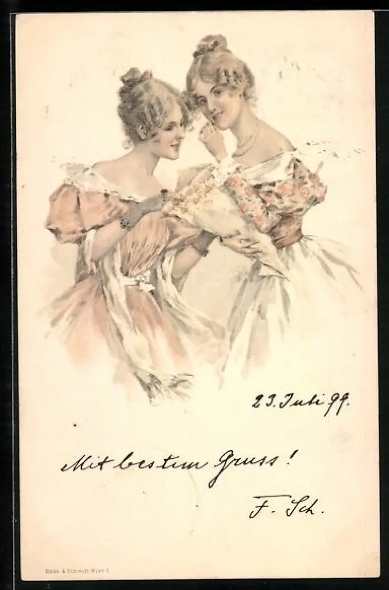 AK Zwei elegante junge Damen betrachten einen Blumenstrauss, Jugendstil