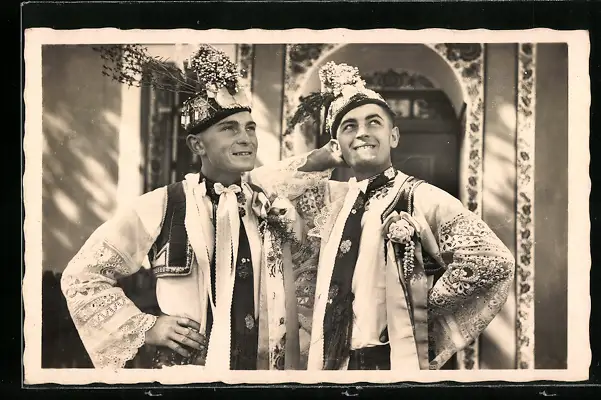 AK Zwei junge Männer in tschechischer Tracht mit Spitzenärmeln