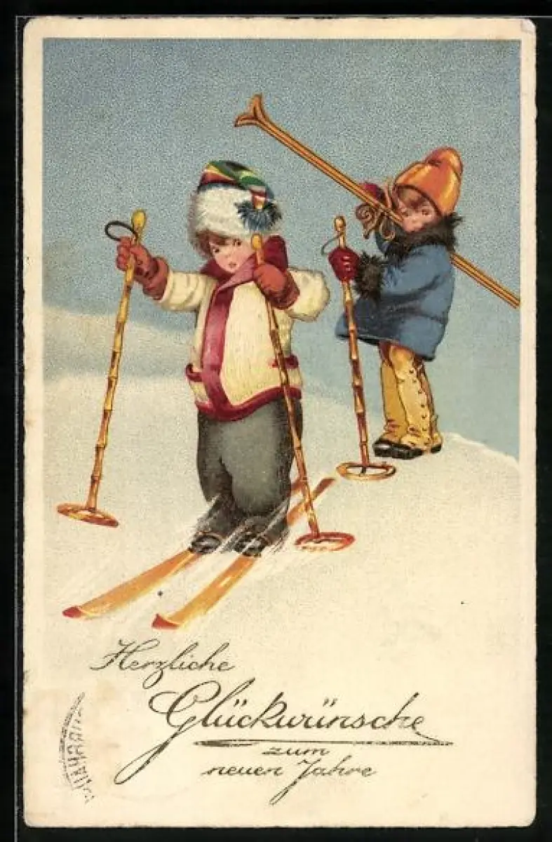 AK Zwei kleine Skiläufer vor der Abfahrt, Neujahrsgruss