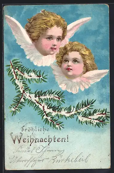 AK Zwei schwebende Weihnachtsengel mit Tannenzweig