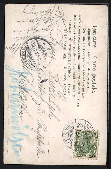 Personenbezogene Daten auf der Rückseite der Karte wurden durch blauen Textmarker unkenntlich gemacht. Die blauen Stellen sind auf die Vorderseite durchgeweicht und wirken sich negativ auf das Postkartenfoto aus
