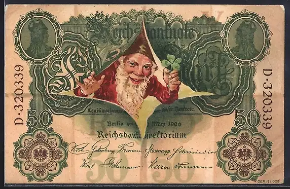 AK Zwerg schaut durch eine Reichsbanknote von Fünfzig Mark