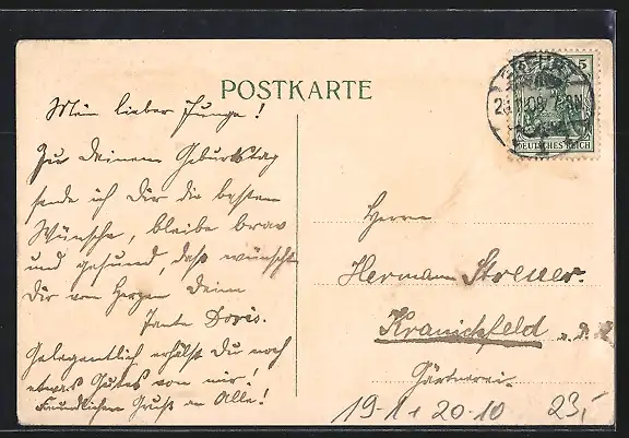 gelaufen 1908, Eckknick re. oben, guter Zustand