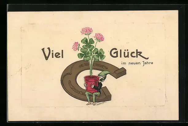 AK Zwerg sitzt mit Kleeblättern auf einem Hufeisen, Neujahrsgruss