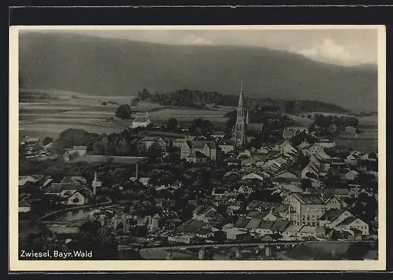 AK Zwiesel /Bayr. Wald, Ortsansicht mit Kirche u. Bergen