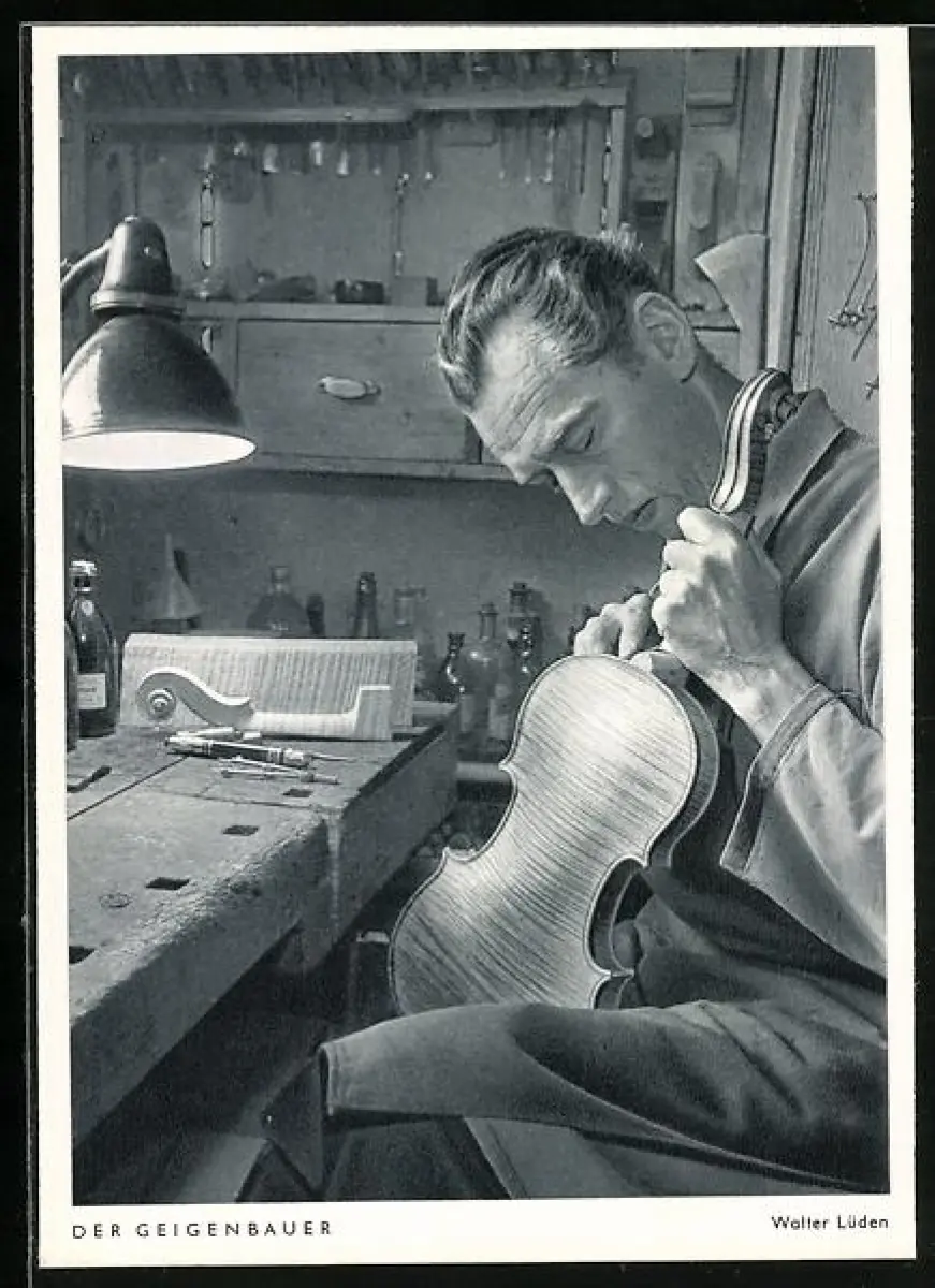 AK der Geigenbauer, Instrumentebauer bei Feinarbeiten an einer Geige