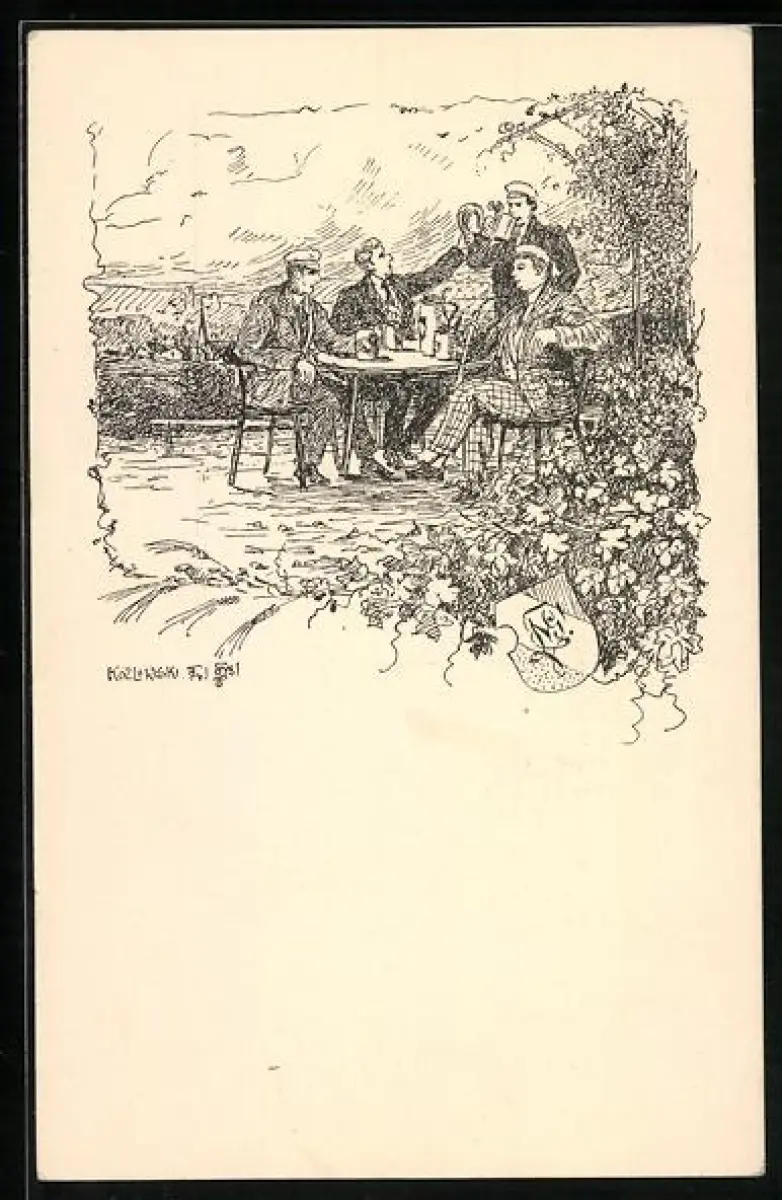 AK feiernde Studenten trinken Bier im Garten vor der Stadt, Wappen
