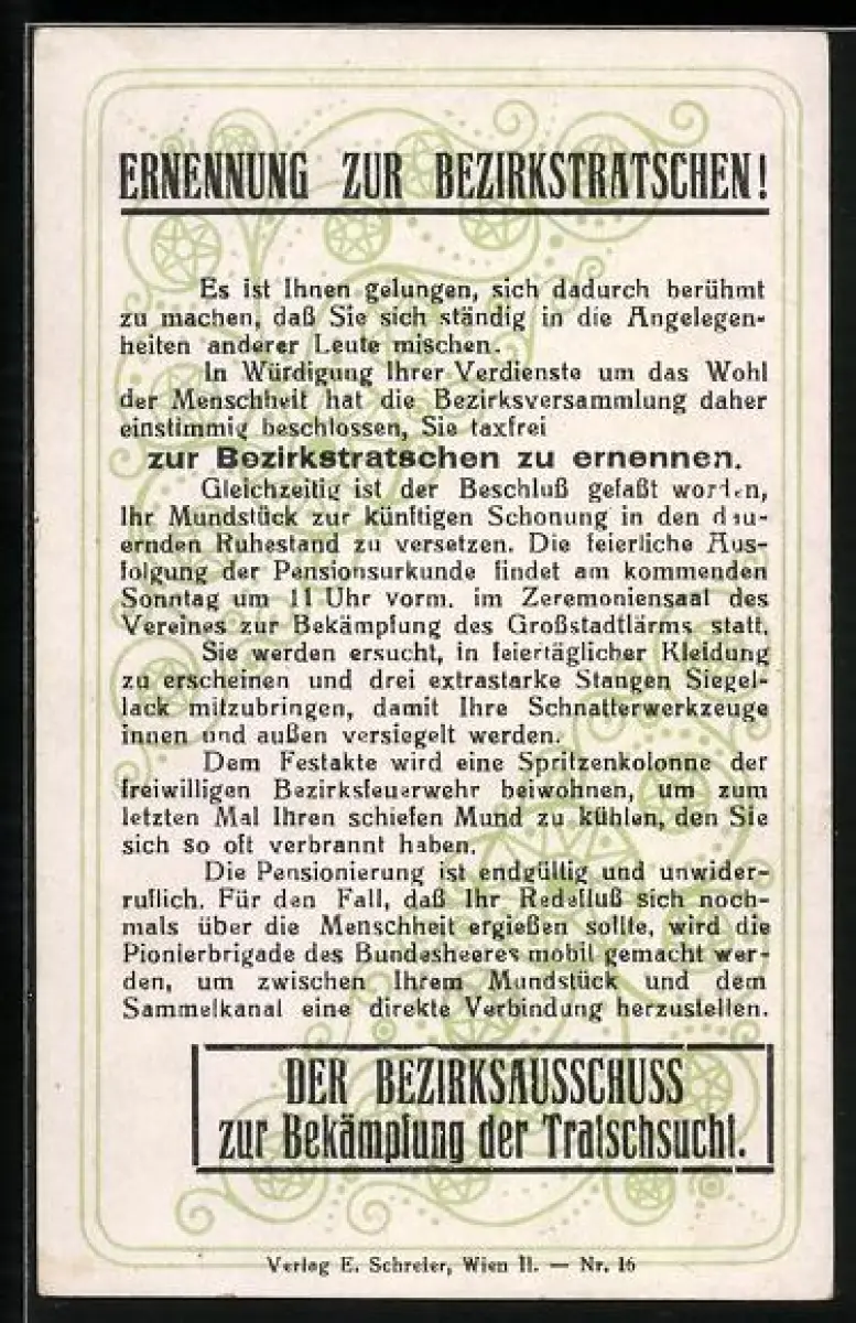 AK frauenfeindlicher Humor, Ernennung zur Bezirkstratschen!