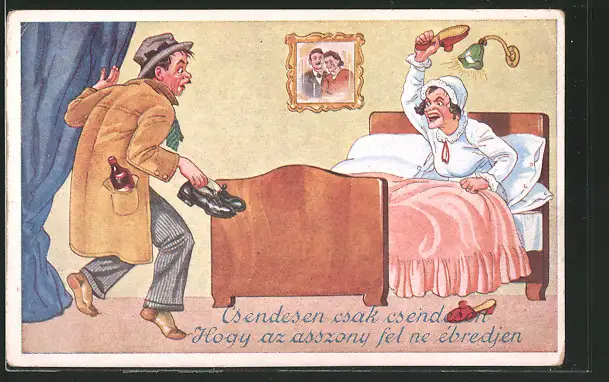 AK frauenfeindlicher Humor, Frau im Bett wirft mit einem Hausschuh nach ihrem Mann der zu spät nach Hause kommt