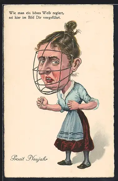 AK frauenfeindlicher Humor, Frau mit Gitter als Maulkorb