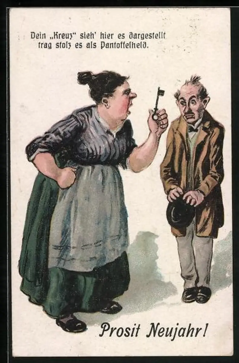 AK garstige Ehefrau zeigt ihrem traurigen Mann den Hausschlüssel, Neujahr