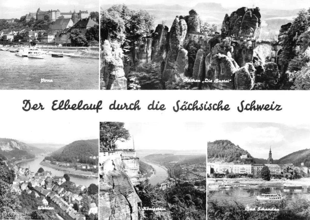 Ansichtskarte im Format 14,5 x 21 cm Der Elblauf durch die Sächsische Schweiz fünf Abb. - Pirna, Bastei, Wehlen, Königstein, Bad Schandau Erhaltung I-II ungelaufen Druckvermerk: 1974 Herstellungsland: DDR Verlag: Planet-Verlag, Berlin - 02 24 00 016 Der