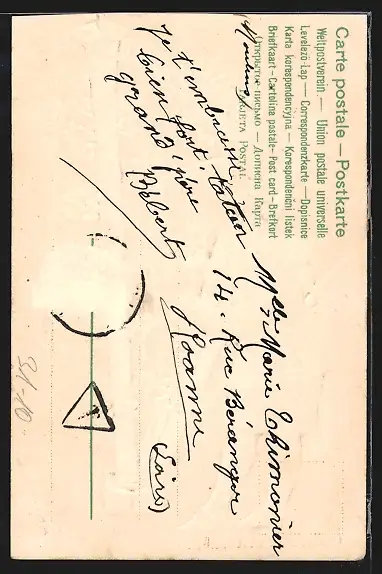 alte Ansichtskarte, gelaufen, Briefmarke entfernt, rückseitig Oberflächenschaden, Abriebspur li. oben, minimaler Einriss re. oben, Stempelspur