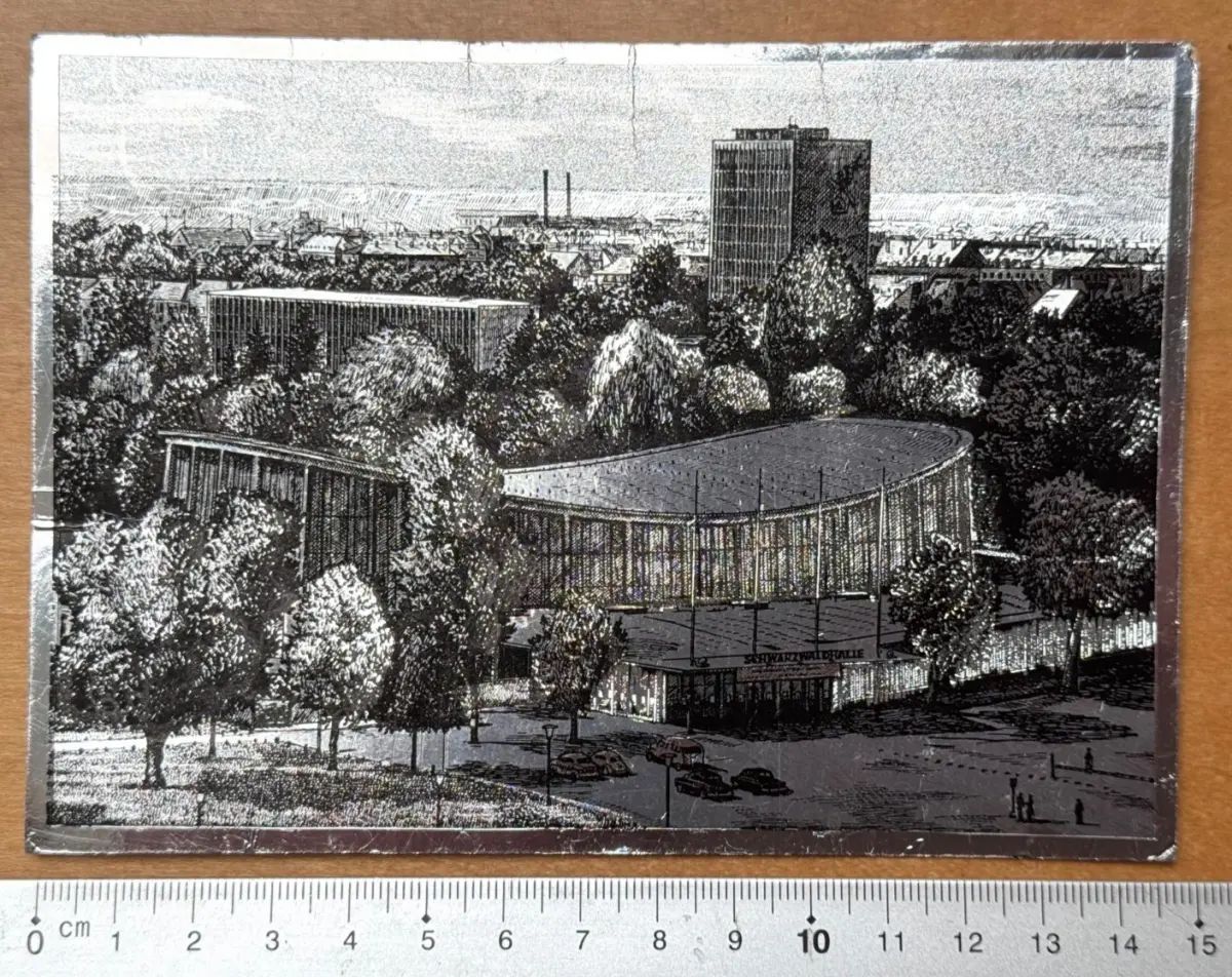 Karlsruhe Schwarzwaldhalle – Original AK mit klarem Blick auf die modernistische Kongresshalle und das dahinterliegende Hochhaus (vermutlich das frühere Technische Rathaus), umgeben von Bäumen, Stadtansicht im Hintergrund.