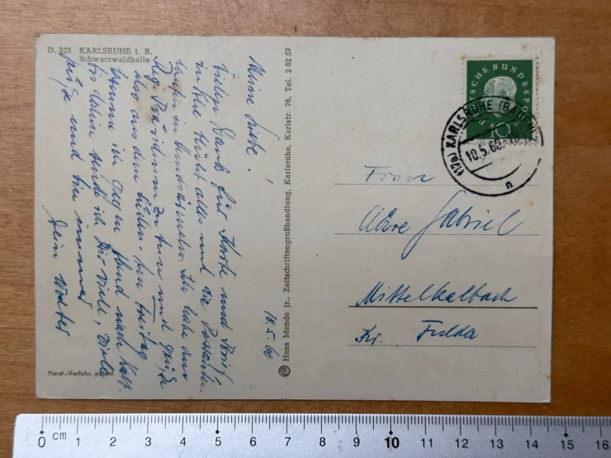 Die Rückseite zeigt eine gelaufene Karte mit lesbarem Poststempel Karlsruhe 10.5.1960. Adressiert an Fulda, mit schönem handschriftlichen Text – typisch für Zeitdokumente dieser Epoche.