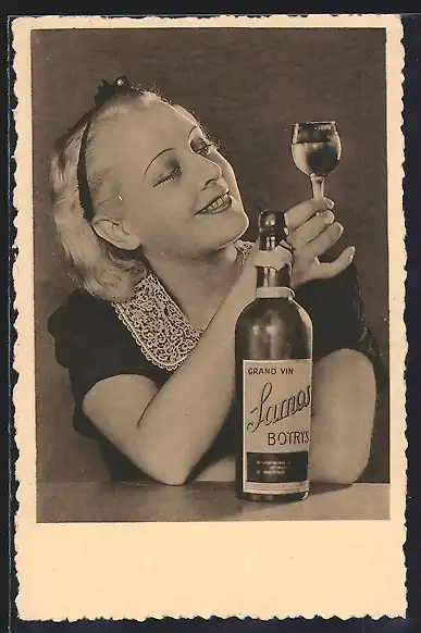 AK junge Dame mit einer Flasche Samos-Botrysi