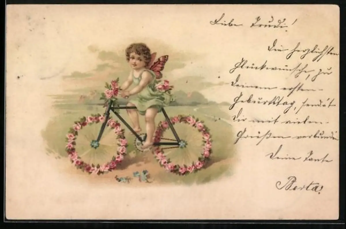 AK kleine Fee fährt auf einem Fahrrad mit Blumen-Reifen