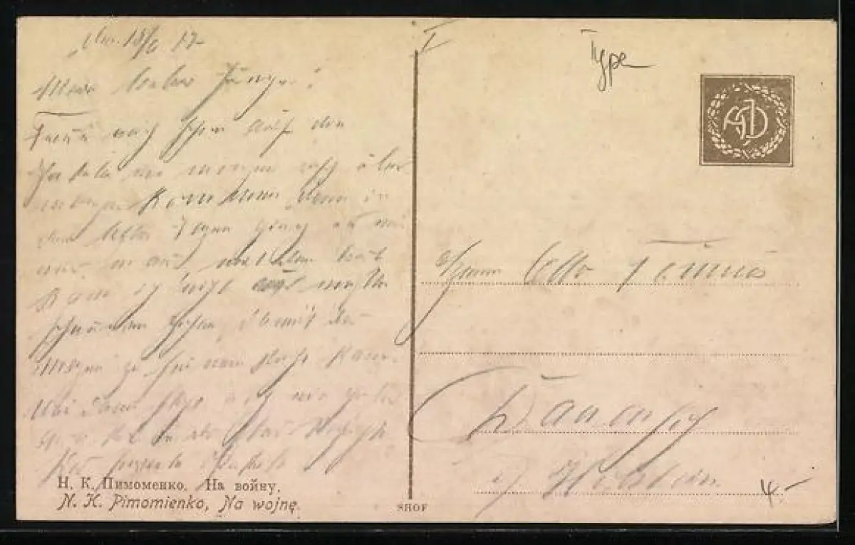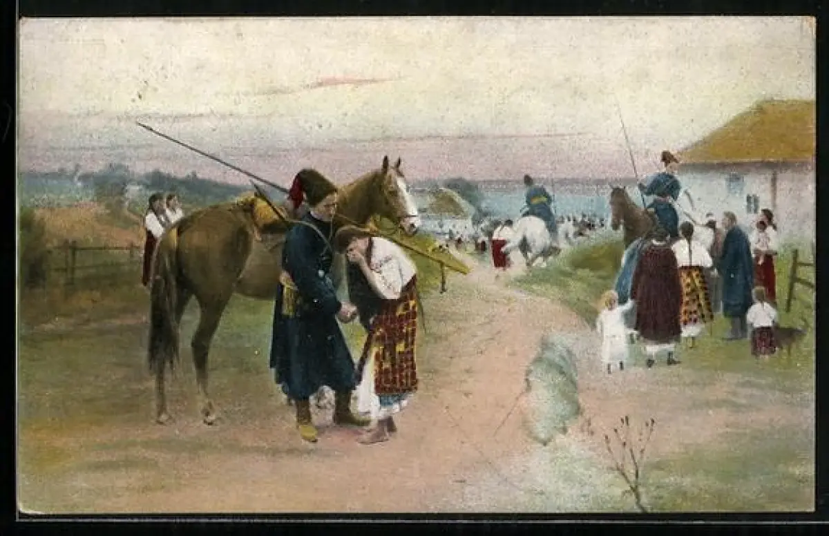 AK russischer Reiter mit weinender Frau, Dorfbevölkerung