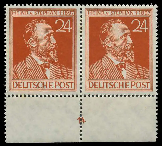 24 Pfg Wert aus der Ausgabe 50. Todestag von Heinrich von Stephan, waagerechtes Unterrandpaar mit Plattennummer 14, leicht stockig, senkrechtem Linie gefaltet