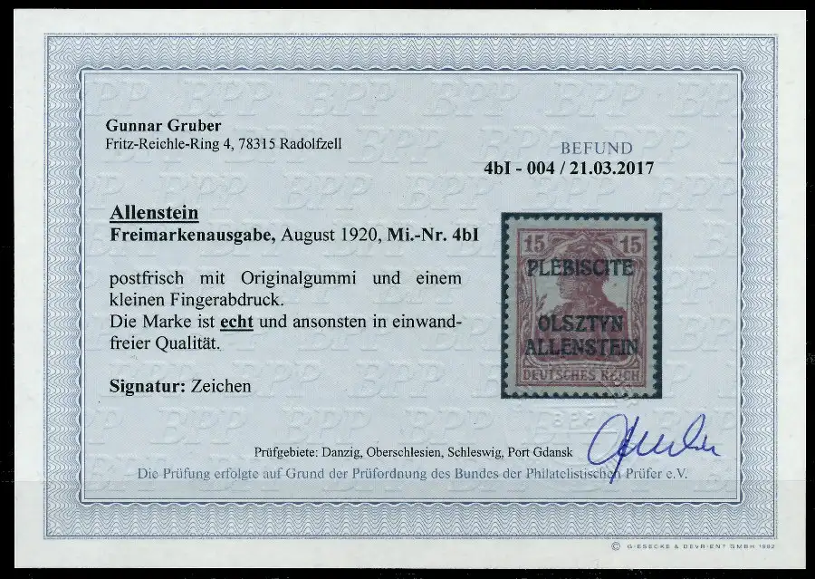 15 Pfg Wert aus der Aufdruckausgabe Allenstein auf den Freimarken des deutschen Reiches (Germania 1916/1918) - Aufdruck 3-zeilig PLEBISCITE..., höherstehend, sogen. Siegesmarke in der b-Farbe, leichte Fingerspur, sonst einwandfrei, mit aktuellem Fotobefund Gruber, als Katalogwert wurde der Wert, der vom Prüfer als Rechnungsgrundlage angegeben wurde verwendet.